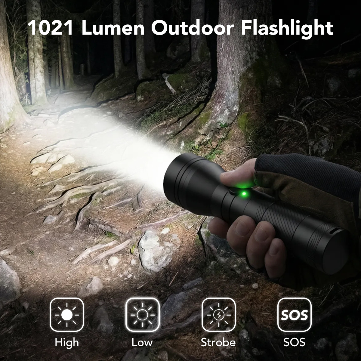 ハイ(1591LM)/ロー(238LM)/ストロボ(1591LM)/SOS(200LM)
